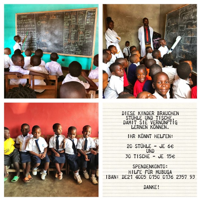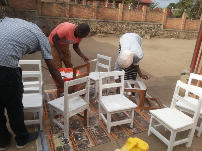 Denn das sind keine Klappstühle zum Schnäppchenpreis sondern haltbare, stabile Stühle, die auch die Familie des Schreiners ernähren wird: 6€ pro Stuhl 15€ pro Tisch. Persönlich frisch gestrichen von den Lehrern. Diese Stühle und Tische kommen natürlich mit, wenn die Grundschule steht!