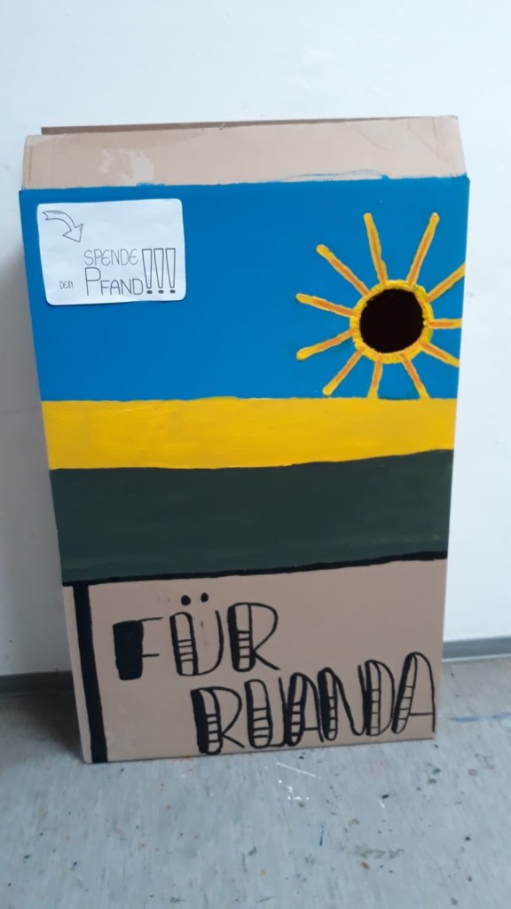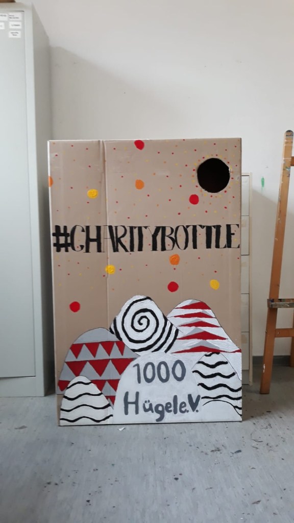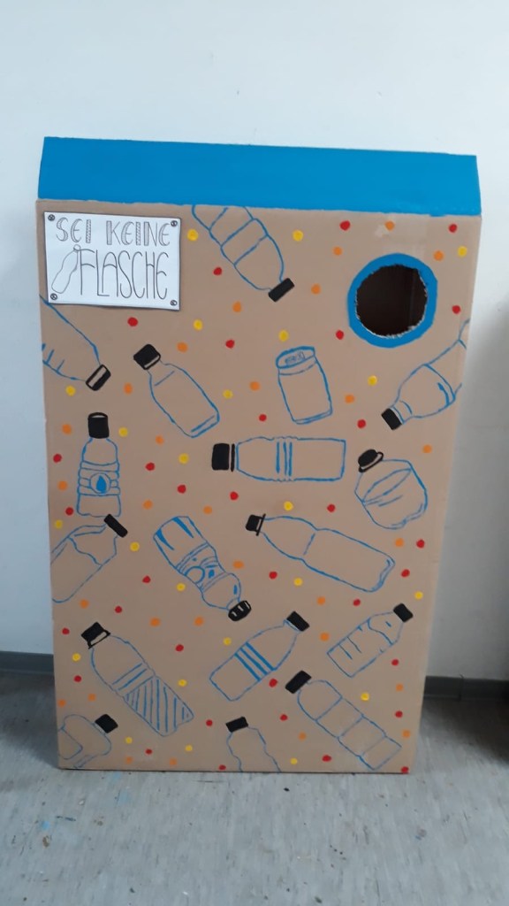 Letze Woche haben wir unseren ersten Karton für das ,,charity bottle“ Projekt fertiggestellt. Er sah sehr gut aus. Weil wir dann noch Zeit hatten, konnten wir noch zwei weitere Kartons bemalen und auch fertigstellen. Nun haben wir drei super coole Kartons für unser Projekt. Nach dem Motto ,,Sei keine Flasche und spende dein Pfand“ werden hoffentlich viele Schüler ihre Flaschen in die Kartons werfen.