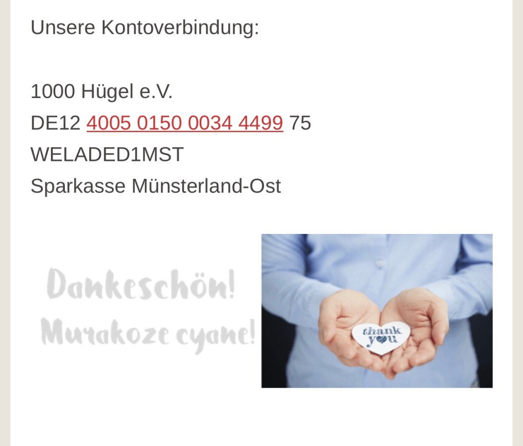 Ein ganz besonderer Dank geht an Kalle und seine Kinder, die sich zur Beerdigung ihrer Frau und Mutter, Spenden statt Blumengestecke gewünscht haben. Dementsprechend auch der Dank an Anjas Freunde, Familie, Nachbarn und Geschäftspartner für Eure Spenden an 1000 Hügel e.V.