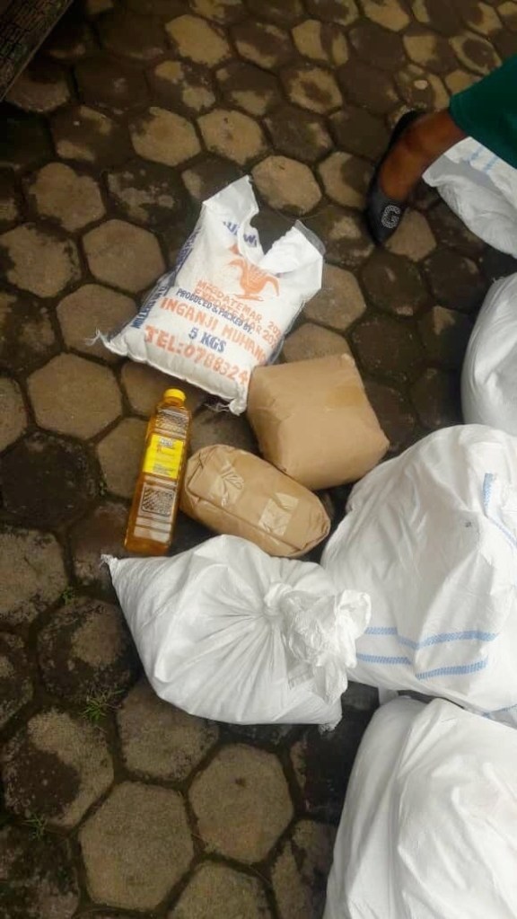 Die ersten 100 Care-Pakete sind am Freitag in Kigali verteilt worden. Jeweils enthalten waren 5 kg Bohnen, 5 kg Reis, 5 kg Maismehl, 3 kg Zucker und 1 Flasche Öl.