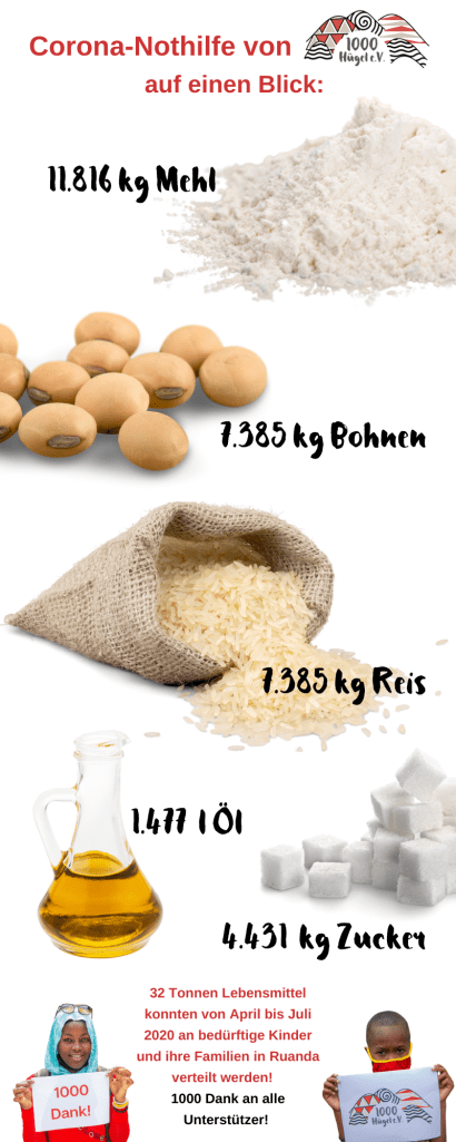 Seit Anfang April läuft unsere Corona-Nothilfe für bedürftige Kinder und ihren Familien in verschiedenen Orten Ruandas. Die nächsten zwei Verteilungen werden gerade vorbereitet. In wenigen Tagen werden so über 32 Tonnen an Lebensmitteln verteilt sein. Das bedeutet umgerechnet etwa 7400 Menschen, denen bisher geholfen werden konnte. Wir hoffen, dass wir noch mehr bewirken können!