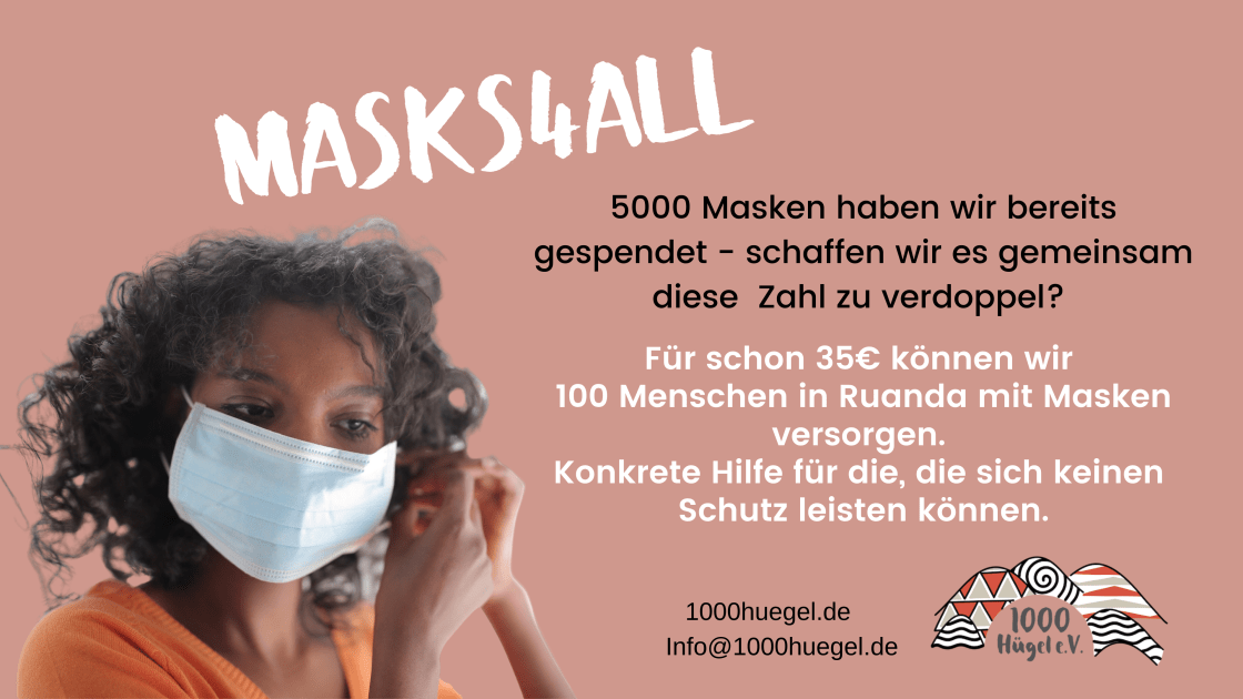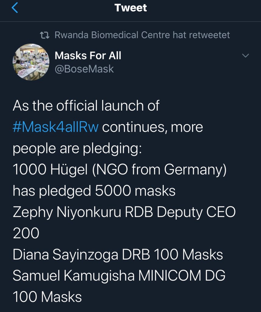 Heute habe ich an einer Videokonferenz zum Launch der Kampagne „Masks4All“ teilgenommen und so erfahren, dass bis zu 6 Millionen Menschen in Ruanda sich diese Masken nicht leisten können. Der deutsche Botschafter Dr. Thomas Kurz hat noch einmal auf die Dringlichkeit hingewiesen.