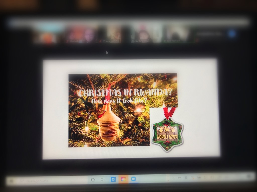 Anschließend ging es etwas besinnlicher zu. Wie wird Weihnachten in Ruanda gefeiert? Was gibt es zu Essen? Gibt es Tannenbäume? Wie werden sie geschmückt? Dürfen sich Familien treffen oder gibt es auch in Ruanda Einschränkungen? Für all diese Fragen und noch einige mehr, stand Laetitia Rede und Antwort.
