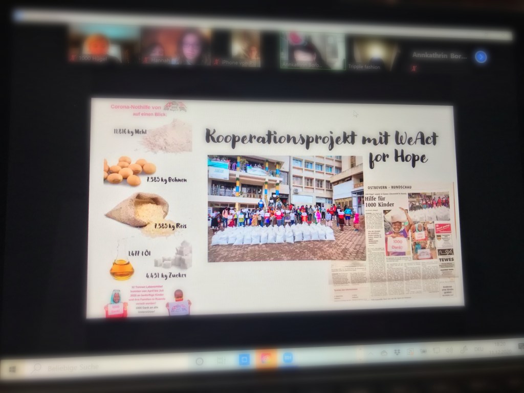 Als besonderer Gast war Laetitia aus Kigali zugeschaltet. Sie hat eindrucksvoll über die Coronasituation während des lockdowns und über die Nothilfe von 1000 Hügel berichtet.