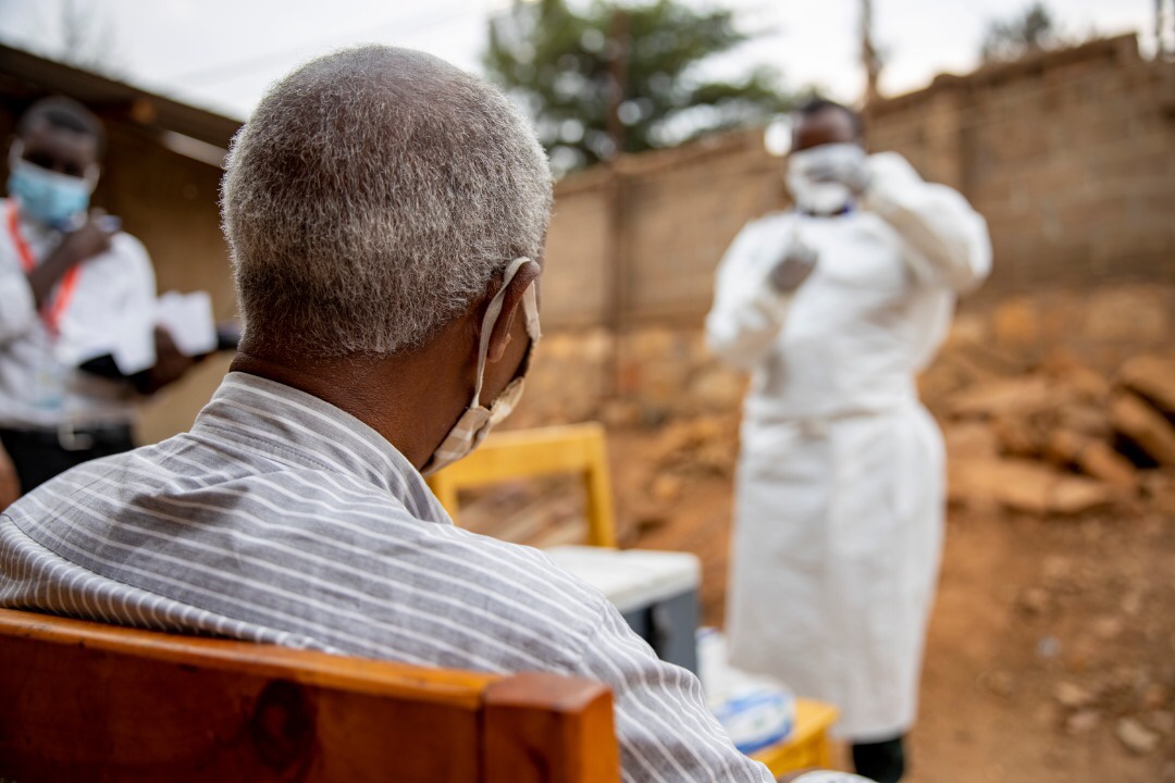 „Lassen Sie uns wissen, ob eine Person ab 60 Jahren eine Impfung benötigt, und wir schicken ein Impfteam“, so das Rwanda Biomedical Centre. Das klingt so leicht und nach „nta kibazo“ – kein Problem. Doch der logistische Aufwand ist enorm. Das mobile Team ist mit Kühltaschen, Spritzen, Schutzkleidung, Impfausweisen etc schwer bepackt unterwegs und laufen zum Teil kilometerweit um die Menschen Zuhause zu impfen.