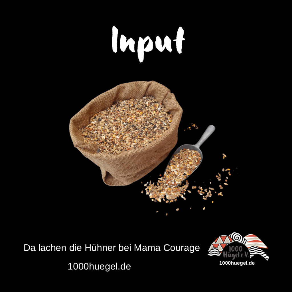 INPUT: Täglich frisches Wasser und etwas Futter, Boden zum Scharren und Auslauf und ein Stall.