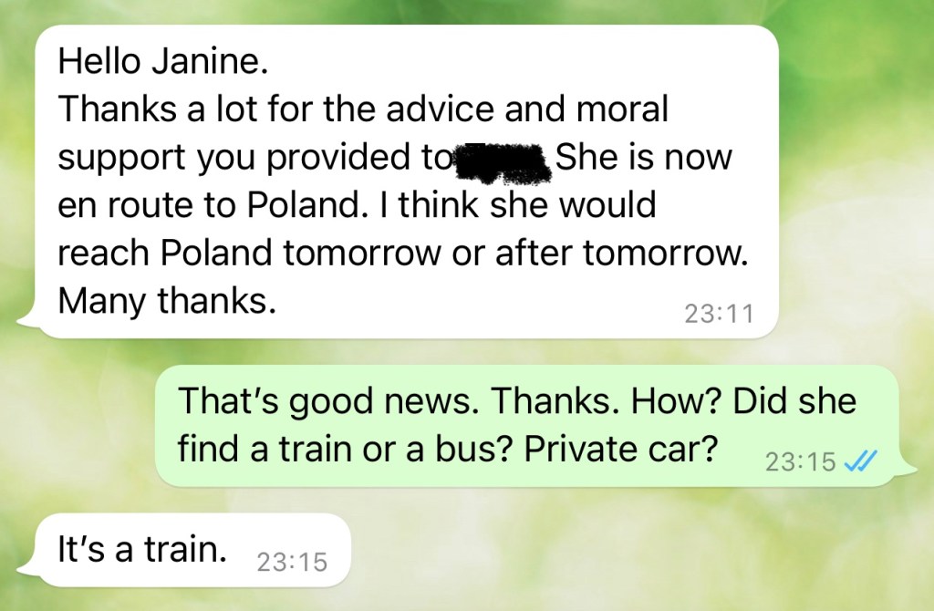 Seit dieser Nachricht vom Freitag ist viel passiert. Wir haben verschiedene Routen „geplant“, mit Organisationen gesprochen, die in den angrenzenden Ländern an den Grenzübertritten aktiv sind. Sie nach ihrer Einschätzung gefragt, überlegt welche Route möglicherweise sicherer ist. Kontakt zu Botschaften aufgenommen, Kontakte zu Politiker:innen geknüpft, auf diversen Kanälen nach Information und Hilfe gesucht. Und bekommen. Irgendwann hatten wir eine ukrainische Telefonnummer von jemanden, der privat Transporte organisiert. Kurze Freude, doch die Nummer war nicht gültig. Weitere Nummern dieser Liste abgeklappert. Wieder Enttäuschung. Falsche Nummern, nicht vergeben, falsch verbunden. Also eine Sackgasse. Weitersuchen, Netzwerk aufbauen. Da bietet jemand an, Flüge nach der Grenze innerhalb Europas zu bezahlen, jemand anderes schickt Geld. Wir leiten direkt weiter. Keine 10 Minuten später wird das Geld in der Ukraine von der Studentin abgeholt. Ein finanzielles Polster für die Flucht. An verschiedenen Grenzregionen stehen unterschiedliche Organisationen parat, sie in Empfang zu nehmen. Plan B steht, an Plan A wird noch gearbeitet.