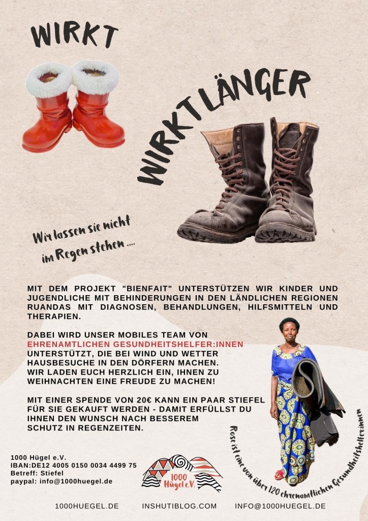 Nach wie vor könnt Ihr natürlich Ziegen und Hühner spenden, doch für dieses Jahr möchten wir Euch gerne Stiefel für die Community Health Worker ans Herz legen. Community Health Worker sind ehrenamtlichen Gesundheitshelfer, die unser mobiles Team täglich im Projekt Bienfait unterstützen. Bei Wind und Wetter machen sie täglich Hausbesuche in ihren Dörfern.