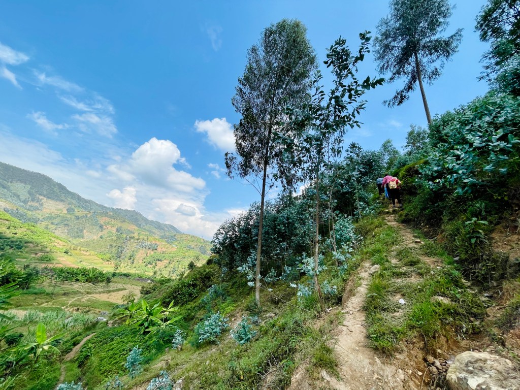 Von hier aus erwartet uns eine kleine Wanderung zu Iradukunda (15 J.), der mit seinem Vater ins Dorf gekommen ist für die Anamnese einer Fehlstellung der Beine. Auch wenn das Team in der aktuellen Situation nichts für Iradukunda tun kann, können sie seinen Vater aufklären und bitten die beiden zu einer Folgeuntersuchung in einem halben Jahr zu kommen.