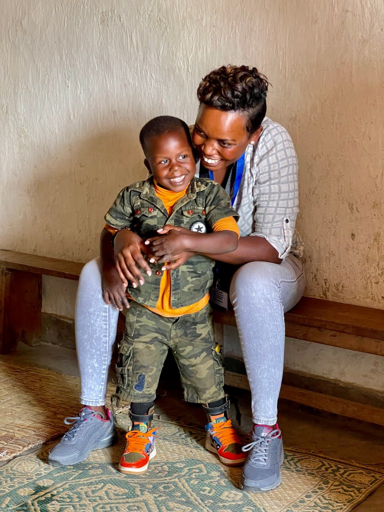 Zunächst besuchen wir David (13 J.), der mit einer Cerebralparese lebt. Seine zierliche Mutter Celestine empfing das Team rührend herzlich, doch als David Hesron sieht, den Physiotherapeuten, strahlt er so sehr, dass nicht zu übersehen ist, dass ihm die Behandlung guttut. Noch vor einem Jahr konnte David nur völlig immobil auf der Seite liegen, Celestine trug ihn. Heute haben sie einen Rollstuhl zu Hause, der es ermöglicht, dass David aufrecht sitzen und sich im Haus bewegen kann. Außerdem macht Celestine täglich Mobilisations-Übungen mit ihm, die Hesron ihr zeigt. Diese zeigen auch bei unserem Besuch umgehend Wirkung, David wirkt zufrieden und entspannt. David kann sich mittlerweile auch drehen und sich durch den Raum bewegen. Erst im Laufe der Gespräche erfahren wir, dass David ein Waisenkind war und Celestine ihn als alleinstehende Frau und selbst verwaistes Kind zu sich nahm. Sie tut alles für sein Wohlergehen und kümmert sich. Sie will außerdem mit der Hilfe von Nachbarn den Zugang zur Straße bauen, sodass David mit dem Rollstuhl auch draußen sein kann. Wir sind überwältigt von einem so großen Herzen, das in Celestine schlägt.