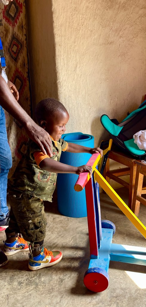 Im Anschluss an die Sitzung fahren wir gemeinsam zu Shilo (6 J.), dessen Mutter am frühen Morgen zweieinhalb Stunden gelaufen ist, um zu dem Eltern-Treffen zu kommen. Als das Team ins Haus kommt, strahlt Shilo über beide Ohren und fällt jedem aus dem Team in die Arme. Seine Großmutter erzählt uns, dass er vor einem Jahr nicht laufen konnte, er konnte nur sitzen. Seit einigen Wochen stabilisieren Orthesen seine Knöchel, sodass er sich jetzt alleine auf den Beinen halten und auch mit Halt laufen kann; Hesron trainiert mit ihm das Laufen am Laufwagen und mit Gehstützen und er macht schon riesige Fortschritte, trotz seiner noch instabilen Hüfte. Es ist kaum zu glauben, wie motiviert und aktiv der kleine Shilo weiter das Laufen üben will, bis er kaum noch Kraft hat, um sich abzustützen.